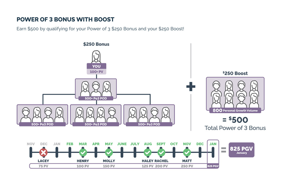 When your Power of 3 Pod(s) are in place for the Power of 3 bonus and you reach Personal Growth Volume (PGV) targets, you boost your earnings! The boost is paid out in addition to the Power of 3 bonus. Each Wellness Advocate can qualify for one boost per account, per month.