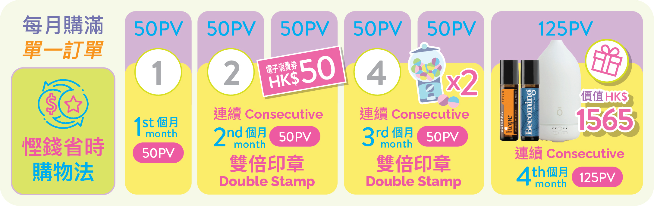 1. 新會員現凡於入會的首12 個月內每月購物滿特定 PV即可獲得印章!集齊所需的印章即可在我們的 dōTERRA 精油生活館換取驚喜禮物!