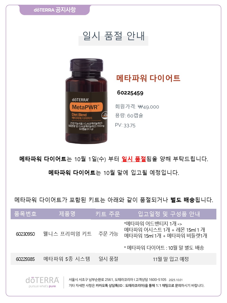 메타파워 다이어트가 포함된 키트는 아래와 같이 품절되거나 별도 배송됩니다.