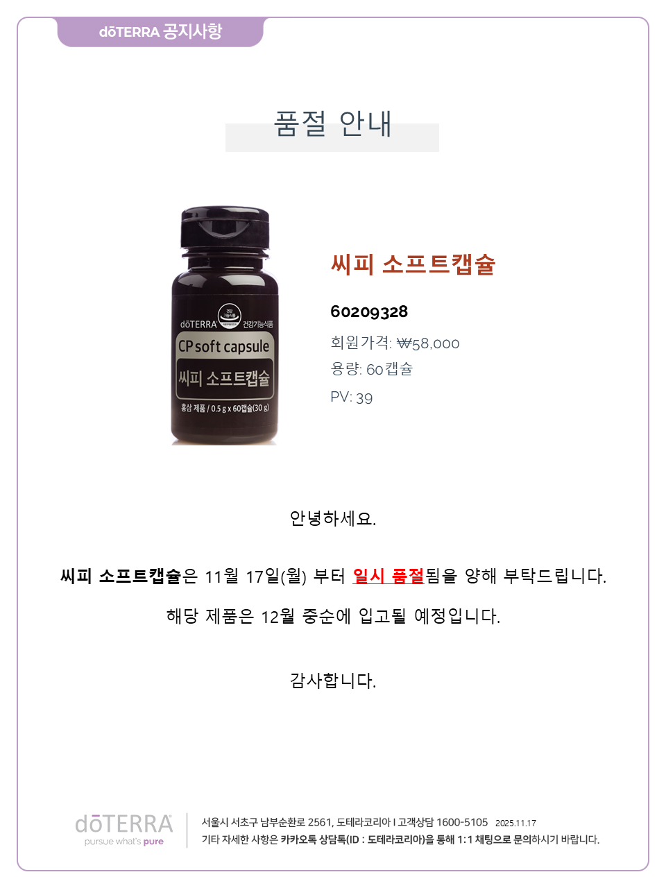 안녕하세요. 씨피 소프트캡슐은 11월 17일(월) 부터 일시 품절됨을 양해 부탁드립니다.