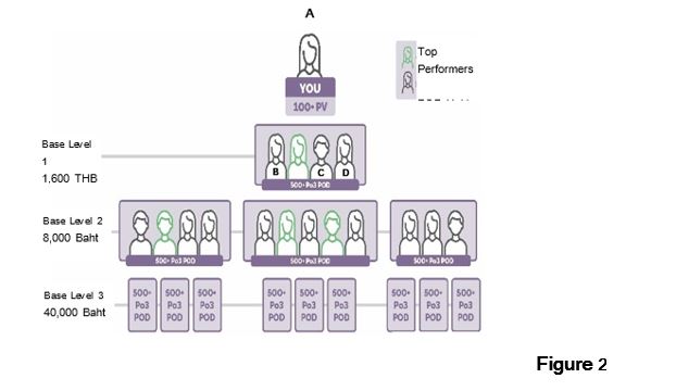 If A wants to earn the Baht 8,000 Power of Three bonus A must achieve a minimum rank of Elite and maintain the qualifications for the Level 1 Power of Three Bonus and also have three additional Pods of 500 PV somewhere on A’s second sponsor level under three separate Wellness Advocates. Those three separate Wellness Advocates do not have to earn their own Level 1 Power of Three Bonus in order for A to earn the Baht 8,000 Power of Three Bonus. The total PV for A to earn the Baht 8,000 Power of Three Bonus is now 2100 PV.
