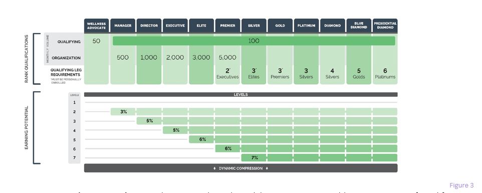 Ranks and Levels. Each Rank corresponds to the number of organizational levels from which the Wellness Advocate can receive compensation. See, Figure 3. For example, the Rank of Executive receives compensation from levels 2, 3 and 4. Generally, as a Wellness Advocate advances in Rank, he or she is paid from deeper levels in his or her Organization, until he or she reaches Silver. All ranks from Silver to Presidential Diamond are eligible to earn at levels 2-7.