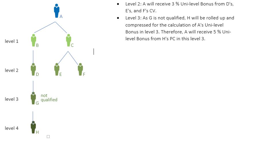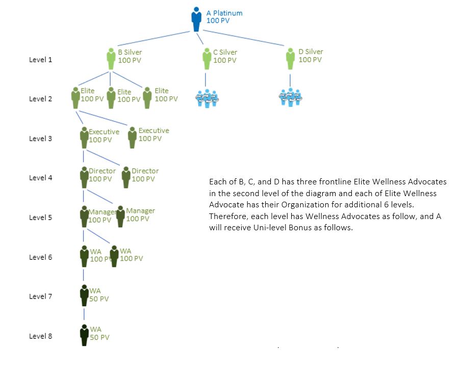 Example A is an Elite Wellness Advocate has an Organization as shown below, i.e. B and C in level 1, D, E, and F in level 2, G (who is not qualified) in level 3, and H in level 4. A is qualified for Uni-level Bonus as follows: