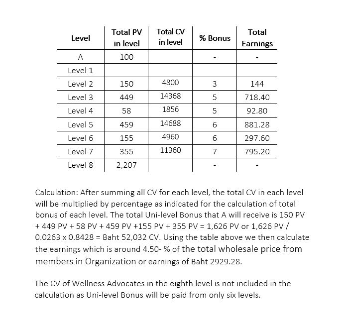 4. Uni-level Commission – 3 - 7 % of CV for 6 levels or average 4.50% of wholesale price