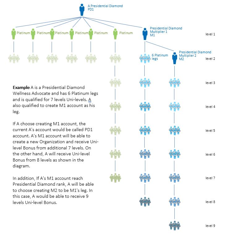 Presidential Diamond Multiplier Account. Presidential Diamonds are permitted to establish an additional account directly under their main Presidential account (“PD1”) called their Multiplier 1 (“M1”) account. Presidential Diamonds who have six solid legs can add new legs to their M1 account and get additional unilevel compensation on the new volume they create through that account, allowing them the opportunity to reach down to the volume 8 levels below their PD1 account.