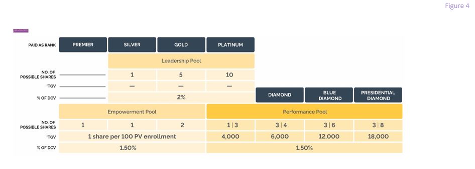 Overview of the Bonus Pools. The Bonus Pools are earned and paid each month to Premier Ranks and above. The Bonus Pools collectively represent five percent (5%) of doTERRA Company Volume (DCV) —the Empowerment Pool (1.5%), the Leadership Pool (2%), and the Performance Pool (1.5%). See, Figure 4. A Wellness Advocate qualifies to be paid from these pools when the Wellness Advocate meets the Rank and designated pool requirements in a particular month. A share’s monthly bonus is equal to the designated pool’s percentage (1.5%, 1.5% or 2%), multiplied by the DCV for the same monthly commission period, and divided by the number of shares of Wellness Advocates who have qualified for a share or shares in the month.