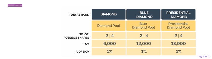 Shares in the Diamond Pools. The Diamond Pool, Blue Diamond Pool, and Presidential Diamond Pool are each equal to one percent (1%) of the total DCV in the monthly commission period. See, Figure 5. Each qualifying Diamond, Blue Diamond and Presidential Diamond receives two (2) share each monthly commission period. A Diamond, Blue Diamond, and Presidential Diamond may earn two (2) additional shares in a monthly commission period when they meet the applicable TGV threshold within their first seven (7) sponsor levels. A Diamond’s TGV threshold is 6,000. A Blue Diamond’s TGV threshold is 12,000. A Presidential Diamond’s TGV threshold is 18,000. The applicable TGV thresholds shall be updated periodically and be published on www.doTERRA.com.