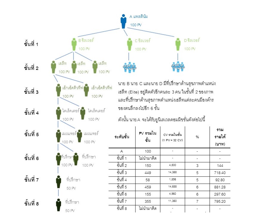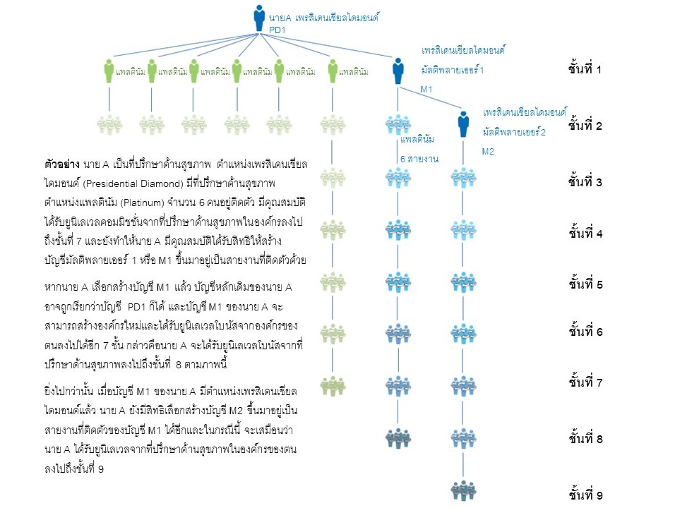 ตัวอย่าง: นาย A เป็นที่ปรึกษาด้านสุขภาพตำแหน่งแพลตินัม (Platinum) และมีนาย B นาย C และ นาย D เป็นที่ปรึกษาด้านสุขภาพติดตัว นาย B นาย C และนาย D เป็นที่ปรึกษาด้านสุขภาพตำแหน่งซิลเวอร์ (Silver) และแต่ละรายมีองค์กรตามภาพที่แสดงต่อไปนี้