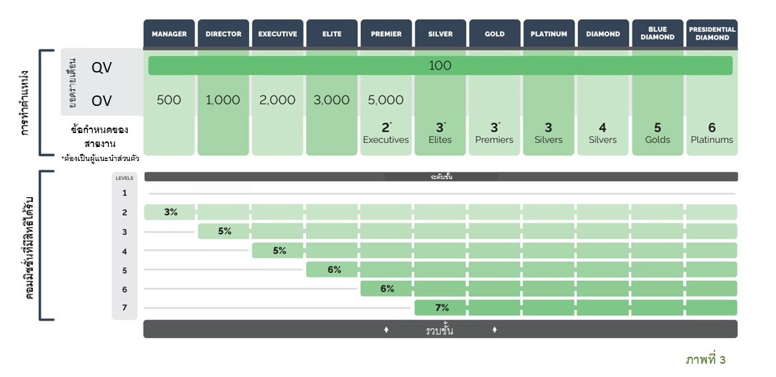 ตำแหน่ง (Ranks) และระดับ (Levels) ตำแหน่งแต่ละตำแหน่งมีความสัมพันธ์กับจำนวนของระดับชั้นในองค์กรที่ที่ปรึกษาด้านสุขภาพจะได้รับค่าตอบแทน โปรดดูภาพที่ 3 ตัวอย่างเช่น ตำแหน่งเอ็กเซ็คคิวทีฟ (Executive) จะได้รับค่าตอบแทนจากระดับชั้นที่ 2, 3 และ 4 ซึ่งโดยทั่วไป เมื่อตำแหน่งของที่ปรึกษาด้านสุขภาพเลื่อนขึ้น ที่ปรึกษาด้านสุขภาพนั้นจะได้รับค่าตอบแทนจากระดับชั้นที่ลึกลงไปภายในองค์กรของตน จนกระทั่งที่ปรึกษาด้านสุขภาพนั้นได้เลื่อนตำแหน่งถึงซิลเวอร์ (Silver) ทุกตำแหน่งตั้งแต่ตำแหน่งซิลเวอร์ (Silver) ไปจนถึงตำแหน่งเพรสซิเดนเชียลไดมอนด์ (Presidential Diamond) จะได้รับการจ่ายค่าตอบแทนจากระดับชั้นที่ 2 ไปจนถึงระดับชั้นที่ 7