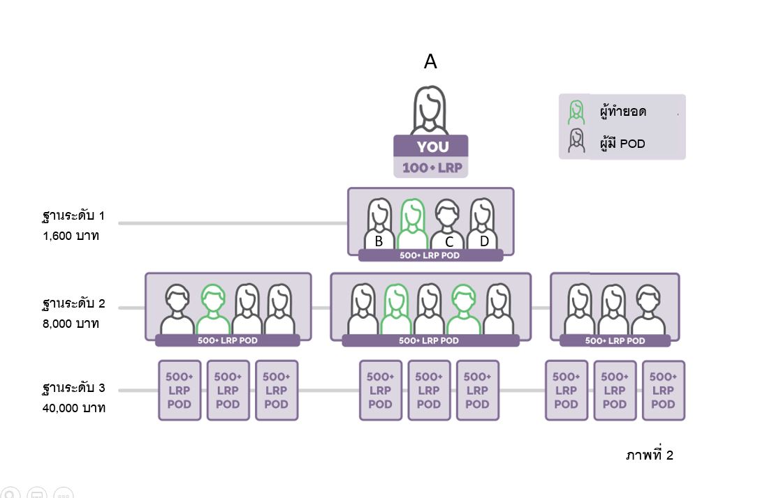 ตัวอย่าง: นาย A เป็นที่ปรึกษาด้านสุขภาพ (Wellness Advocate) ตำแหน่งแพลตินัม (Platinum) เข้าร่วมและทำคำสั่งซื้อภายใต้โปรแกรม LRP จำนวน 100 PV ต่อเดือน โดยมีนาย B นาย C และนาย