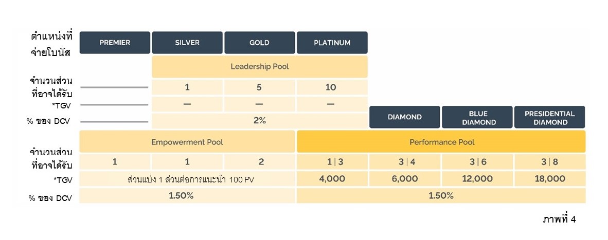 5. โบนัสพูล (Bonus Pools) – โบนัสที่มีความสัมพันธ์กับผลงานของผู้นำ: 5% จาก DCV หรือ 0.011 ของราคาสมาชิก