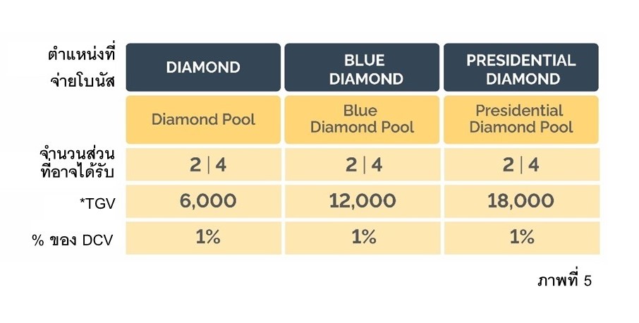 6. โบนัสกองกลางไดมอนด์พูล (Diamond Pools): 3% ของ DCV หรือ 0.101% ของราคาสมาชิก