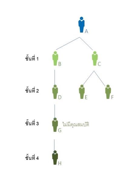 • ชั้นที่ 3: เนื่องจากนาย G ไม่มีคุณสมบัติ นาย H จะถูกรวบชั้นขึ้นมาเพื่อคำนวณยูนิเลเวลคอมมิชชั่นในชั้นที่ 3 ของนาย A ดังนั้น นาย A จะได้รับยูนิเลเวลคอมมิชชั่น 5% จากยอดของนาย H