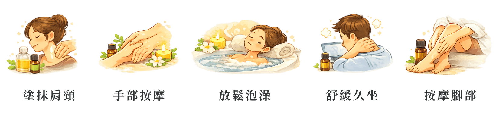 - 電腦使用太久肩頸又酸又緊繃,塗抹芳香調理在不舒服的部位,輕輕按摩以得到舒緩。