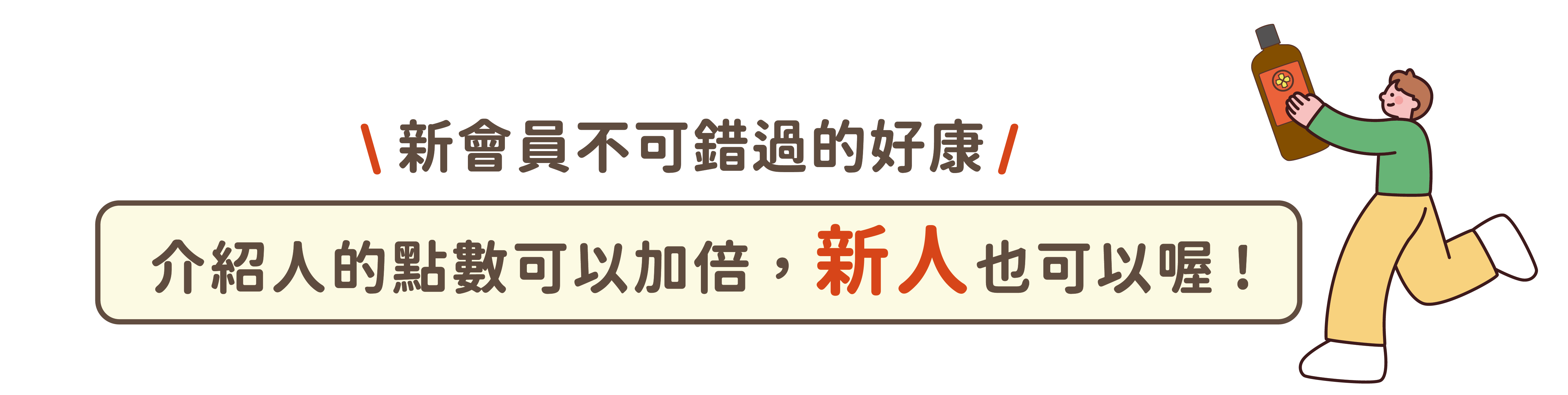 - 新人首購單筆訂單滿 125PV(含)以上並成功付款,可獲得 50 點產品點數,兌換自己喜愛的商品。