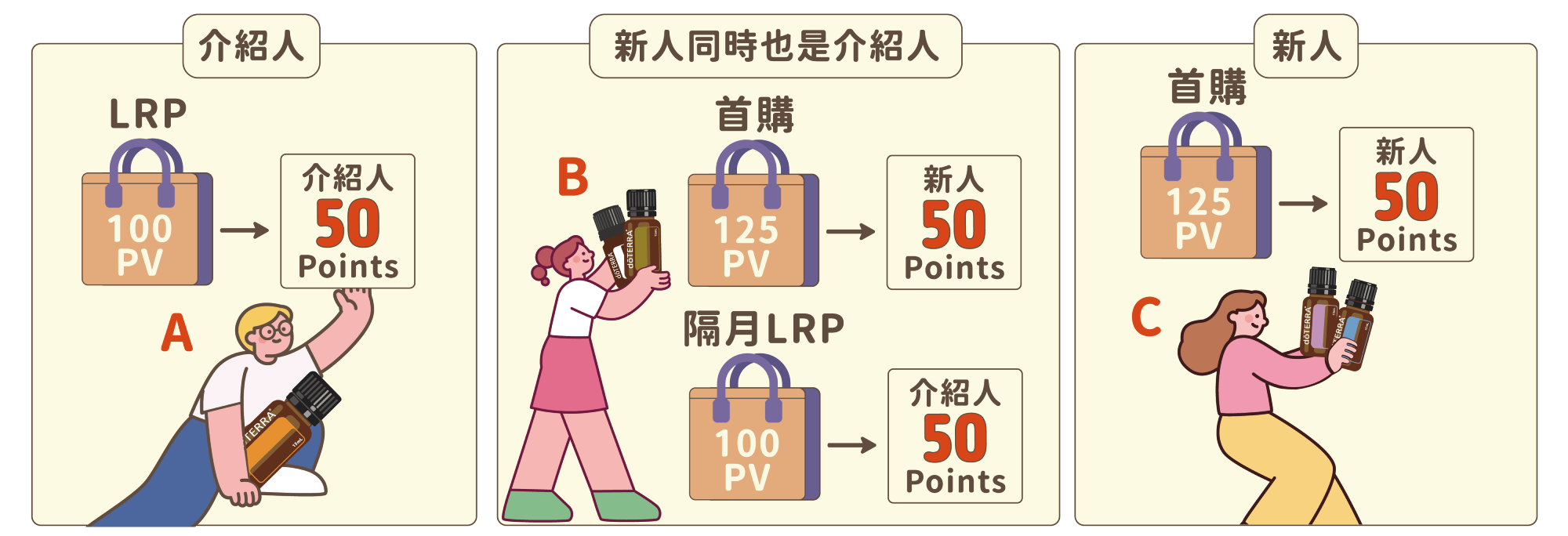 - 介紹人也可同時獲得 50 點產品點數(介紹人於介紹當月須完成單筆LRP 100PV台灣市場訂單)。