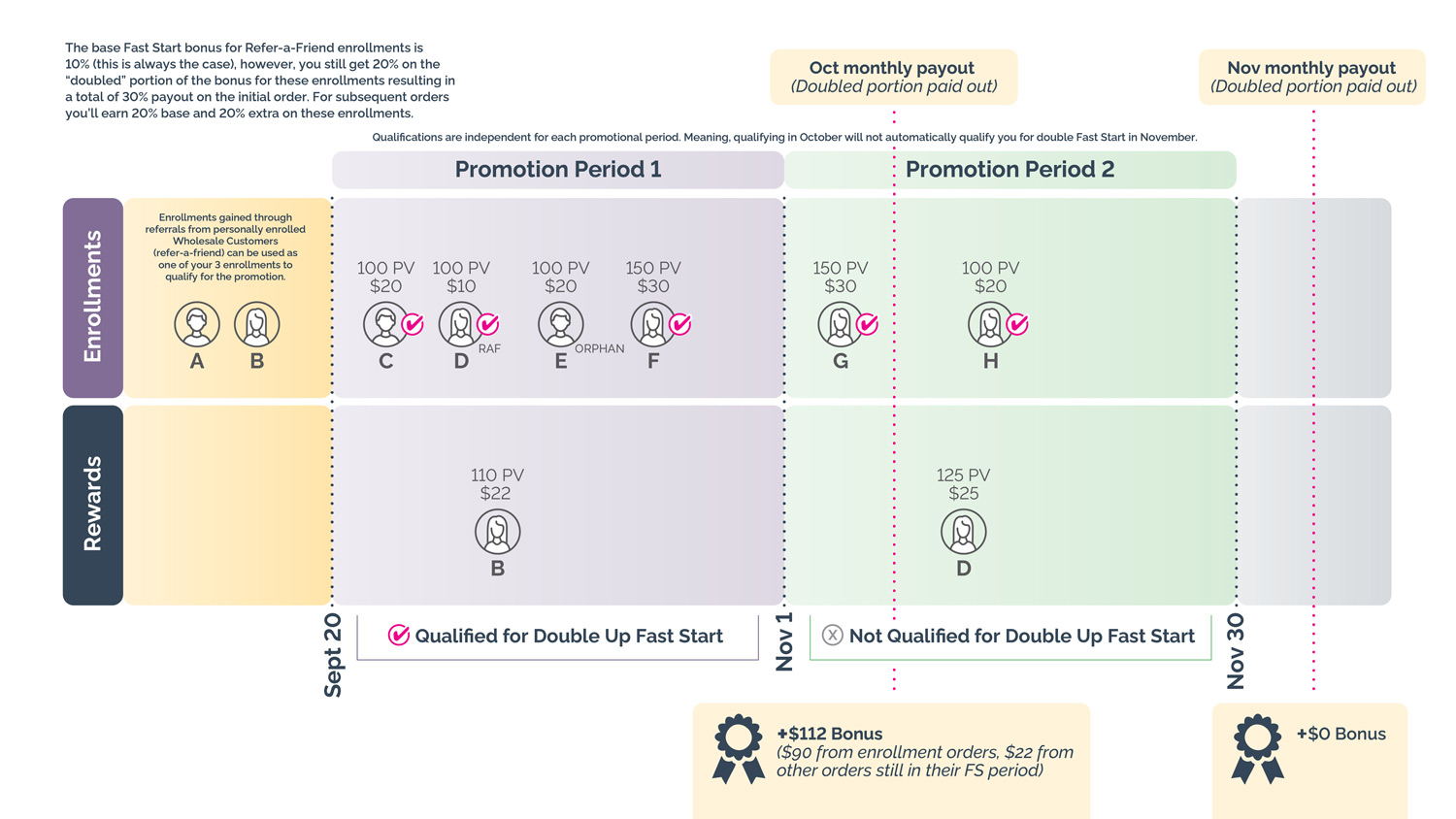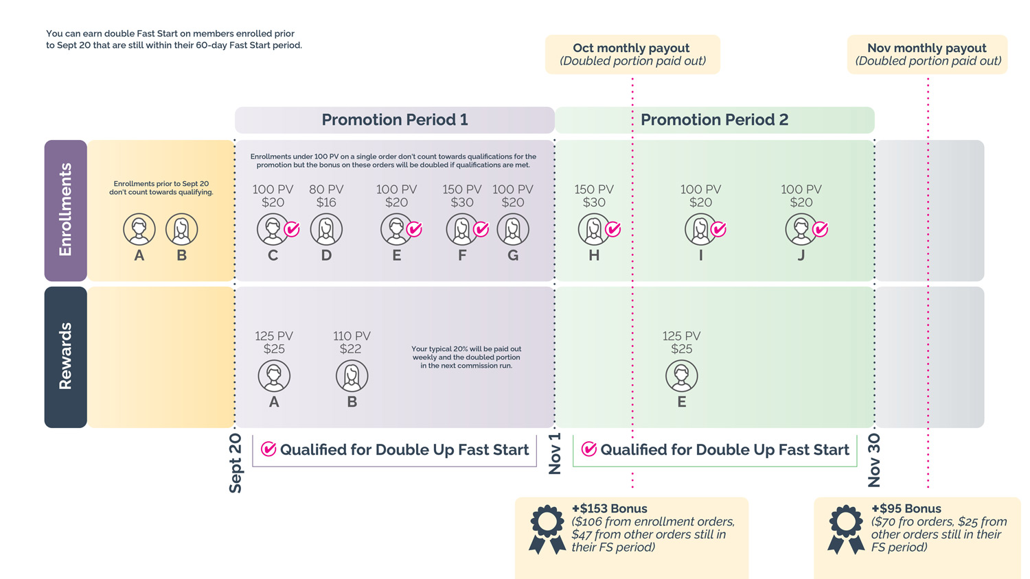For example, if you enroll three people during the October promotional period, you will be paid the Double Up Fast Start bonus on your November commission payout.